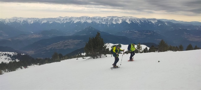 Després de fer les fotos de rigor i picar quatre ganyips, emprenem la baixada. Els esquiadors, buscant el millor descens, baixen cap a Prat Miró. La resta desfem el cami cap al coll de Dalt. Tot baixant entre el bosc, ens sorprèn una abundant nevada, que fa que per una estona, el paisatge esdevingui màgic.