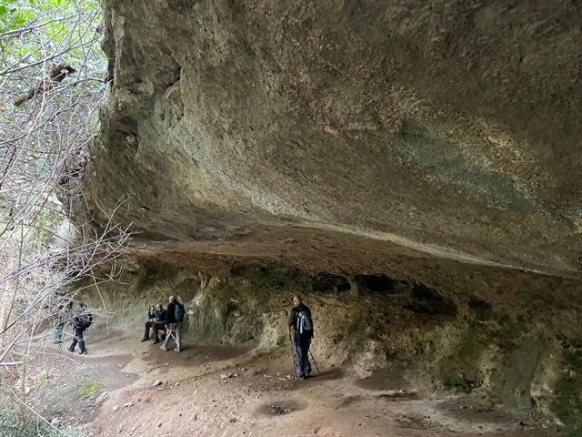 Prenem direcció est per corriols de muntanya per visitar la balma de can Soteres. Aquesta és una gran balma situada a un nivell inferior a la pista que seguim, i cal estar atents per trobar-la, ja que cal fer un petit desviament que condueix a aquest lloc.