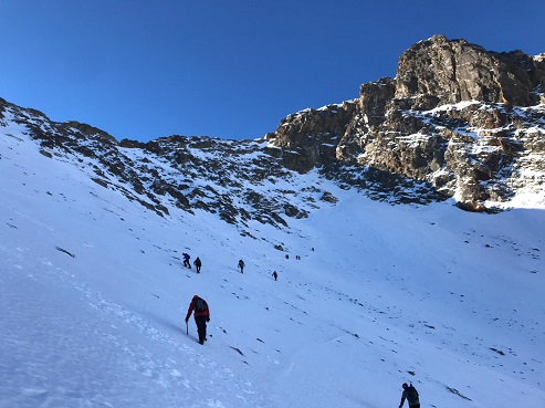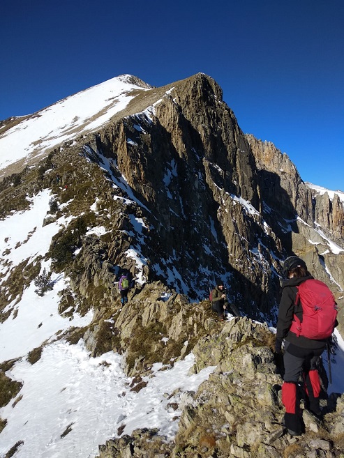 La neu estava perfecta per anar amb grampons, en fila índia, començàvem a pujar per la cara nord entre els dos Gra de Fajols. Quin dia aquell! Semblaven les rambles de Vallter amb tanta gent! Nosaltres ja n'érem un bon grapat!