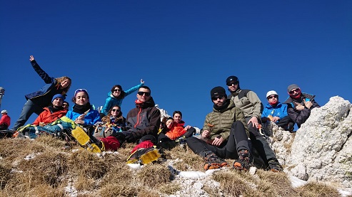 Arribats tots als cim i havent passat la primera prova d'ascensió amb grampons, vam decidir fer parada de cara al sol ben calentets i a dinar! Les vistes eren espectaculars i amb la màgica nova aplicació de World Summits que ens va ensenyar la Núria, vam poder identificar tots els cims del nostre voltant.