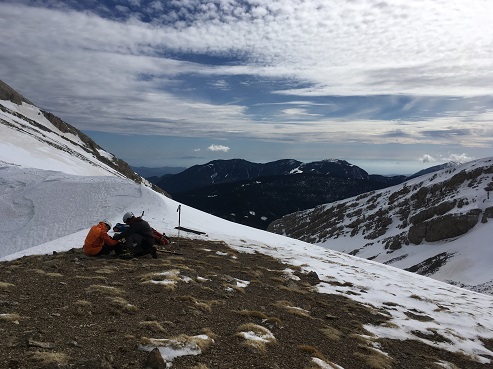 Superat aquest tràngol, ja som dalt, molta calma i una bona baixada ens espera. La rampa de la canal casi gelada impressiona una mica. Reparem amb un cordino que porta l’Amat els esquís d’en Miquel, ens els calcem i amb el piolet a la mà perquè no ens en fiem de la neu comencem a baixar. Un gir... dos girs... i a baixar lliscant, la neu no està molt amable com per jugar-te una relliscada i acabar a Querforadat directa. Sortint de la canal millora una mica ja que hi ha zones amb neu ventada però no transformada i es deixa fer, això sí, els canvis d’una a l’altra són constants. Uns metres més avall en Miquel arriba amb una mica de sang a la barbeta, alguna que altra caiguda a la canal sembla que ha hagut però sense més conseqüències per sort. El tram final... ara sí, neu primavera per acabar i eslàlom de bosc, encara salvarem l’esquiada. I a caminar fins al poble, on retrobem a en Joan que a mitja pujada havia tirat enrere ja que encara l’hem de recuperar del turmell. Vinga bou que ja ho tens això!