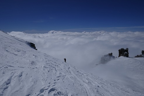 Amb tot això la boira es fa més present i intensa i ens tocarà baixar amb molta precaució de no equivocar-nos de vesant per no baixar més ràpid del compte. Sort que anem equipats tecnològicament i això ens permet seguir l’itinerari de pujada sense desviar-nos massa i evitant els perills. Finalment sortim de la boira i trobem una pala amb una neu prou bona per a gaudir-la.